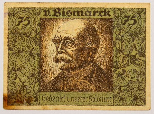• Numismática, África colonial alemã. Cédula centenária com crescente procura e valor. Marcas do tempo. Bismark.