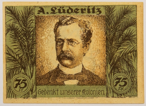 • Numismática, África colonial alemã. Cédula centenária com crescente procura e valor. Marcas do tempo. A Luderite.