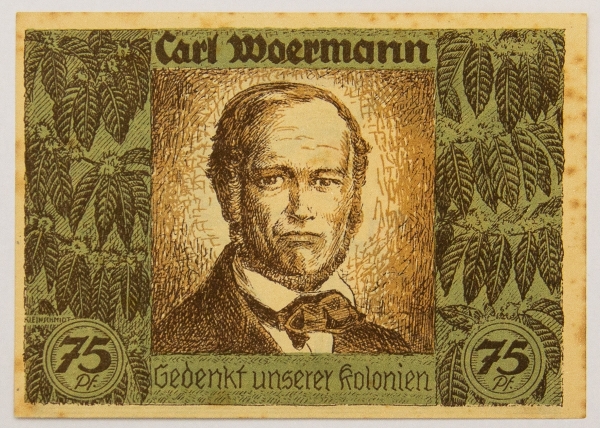 • Numismática, África colonial alemã. Cédula centenária com crescente procura e valor. Marcas do tempo. Carl Woermann.