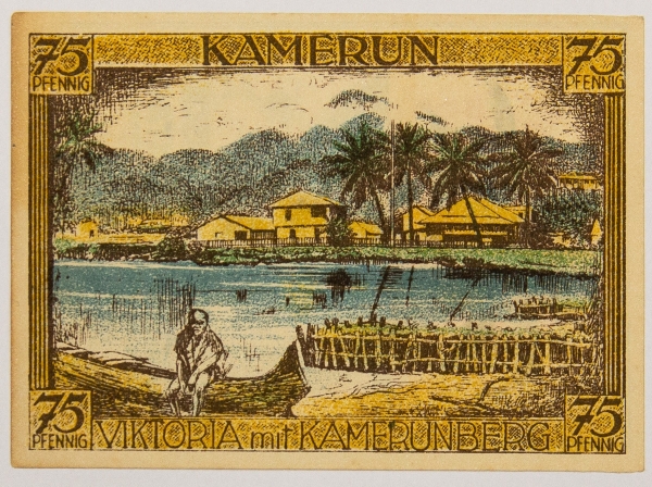 • Numismática, África colonial alemã. Cédula centenária com crescente procura e valor. Marcas do tempo. Camaroes.