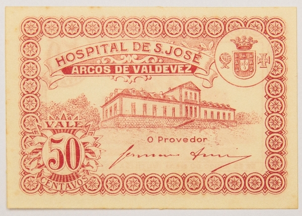 • Numismática, Portugal. 50 centavos. Hospital São José. Arcos de Valdevez. Anos 20. Flor de estampa.