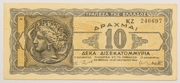 • Numismática, Grécia. 10 Dracmas. 1944.