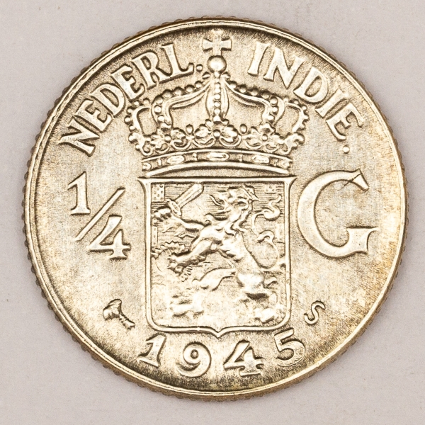 • Numismática, Índia Holandesa. 1/4G. 1945. Prata.