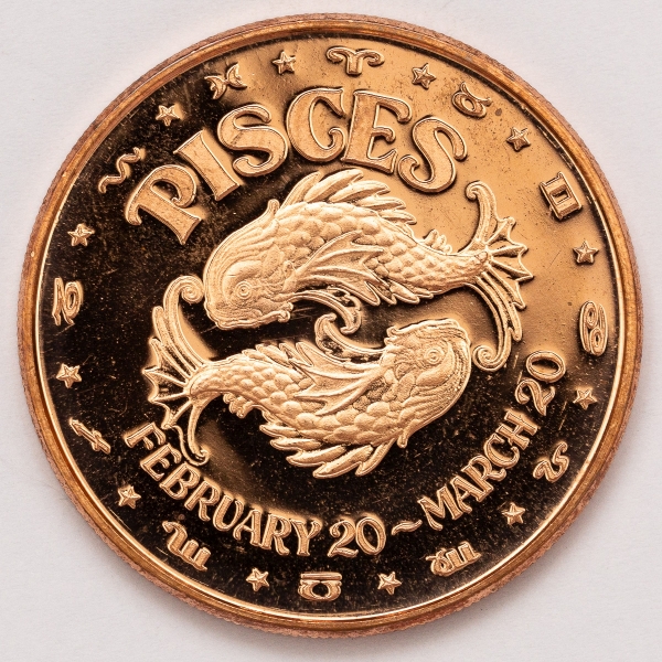 • Numismática, USA.  Onça de cobre. Grande procura pela temárica. Signo Peixes.