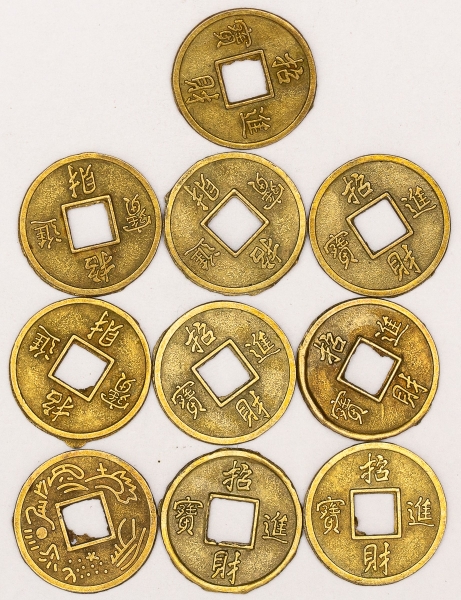 • Numismática, China. Lote com 10 moedas chinesas feng-shui. Talismã da sorte, riqueza, dinheiro e fortuna. Bronze. 13mm.