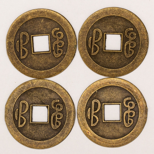 • Numismática, China. Lote com 4 moedas chinesas feng-shui. Talismã da fortuna, sorte e prosperidade. Bronze. 25mm.