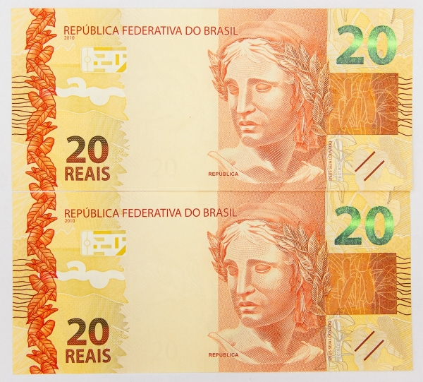 • Numismática, Brasil. Lote com 2 cédulas de 20 reais sendo: JH006279359 e JH006279360. Flor de estampa.