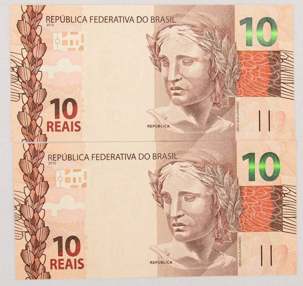 • Numismática, Brasil. Lote com 2 cédulas de 10 reais sendo HG010220614 e HG010220615. Seriadas. Escassas. Flor de estampa.