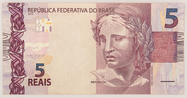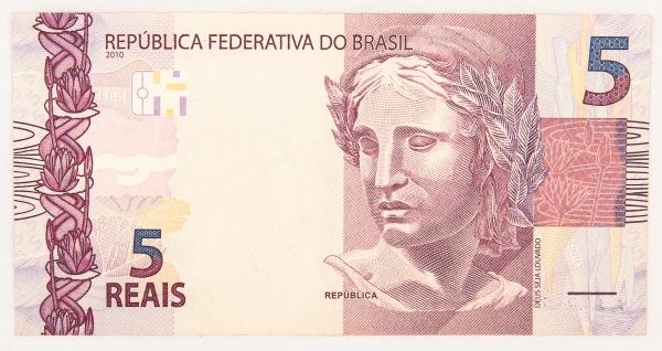 • Numismática, Brasil. Cédula de 5 reais. Série AA033027403. Escassa. Flor de estampa.