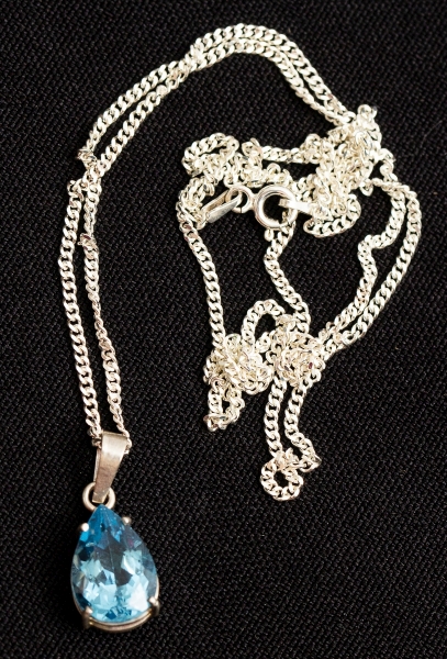 • Joia em prata 925 e topázio azul. Cordão com 59cm aberto. Peso total 5,4g. Jóia nova.