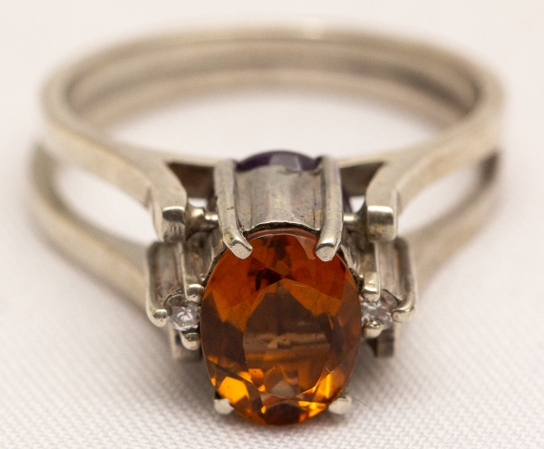 • Joia Anel dupla face. 4 brilhantes. Pode ser usado com a ametista ou o citrino iraí. Vide fotos. Aro interno 11mm. Peso total. 3,91g.