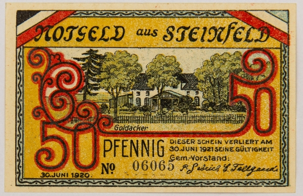 • Numismática, NOTGELD. Uma Cédula Steinfeld 50 Pfennig 1920