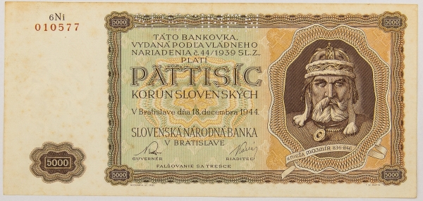 • Numismática, SLOVAKIA. Uma Cédula P-14 5000 Korun 1944 Specimen Rara
