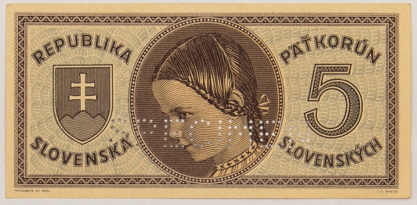 • Numismática, SLOVAKIA. Uma Cédula 5 Korun Specimen