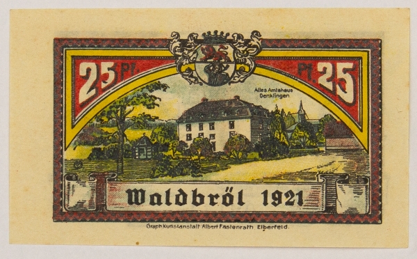 • Numismática, NOTGELD. Uma Cédula Waldbröt 25 Pfennig 1921