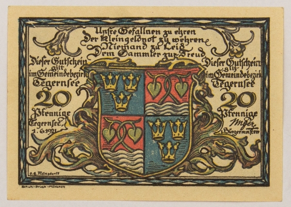 • Numismática, NOTGELD. Uma Cédula Tegernfee 20 Pfennig
