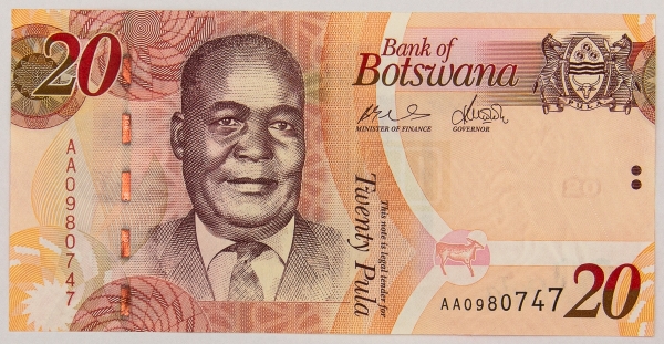 • Numismática, BOTSWANA. Uma Cédula P-31 20 Pula 2009 Flor de Estampa