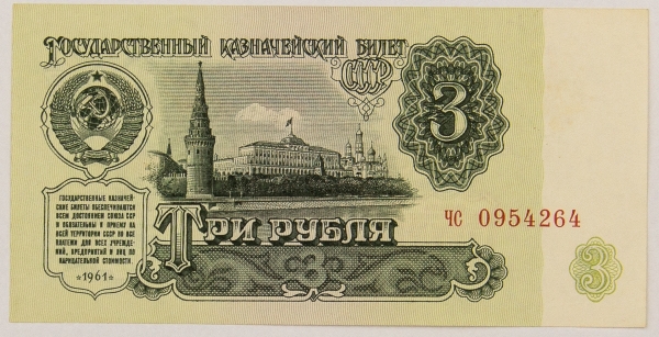 • Numismática, RUSSIA. Uma Cédula 3 Rublos 1961 Flor de Estampa