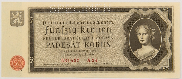 • Numismática, BOHEMIA & MORAVIA. Uma Cédula P-5 S 50 Korun 1940 Specimen Flor de Estampa
