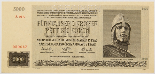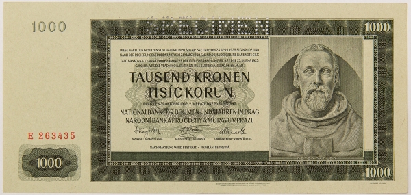 • Numismática, BOHEMIA & MORAVIA. Uma Cédula P-17 S 5000 Korun 1942 Specimen Flor de Estampa