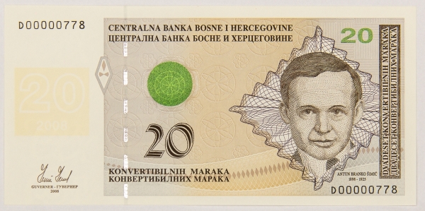 • Numismática, BOSNIA & HERZEGOVINA. Uma Cédula P-65 20 Maraka 1998 Flor de Estampa